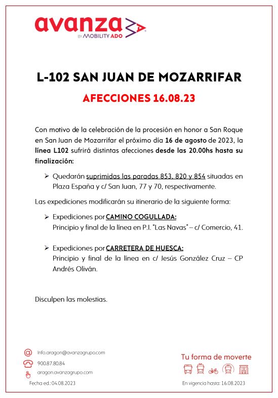 (14/8/2023) El miércoles 16 de agosto, desde las 20:00 horas y hasta la finalización del servicio, los actos organizados obligan a desviar el servicio de transporte público en San Juan de Mozarrifar.