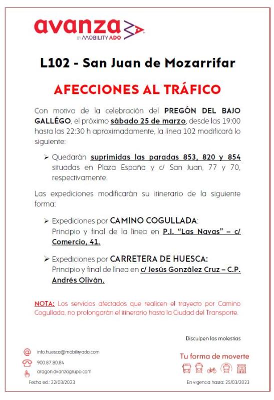 El sábado 25 de marzo, de 19:00 a 22:30 horas aprox. la L102 modifica recorridos y paradas por evento festivo en San Juan de Mozarrifar.
