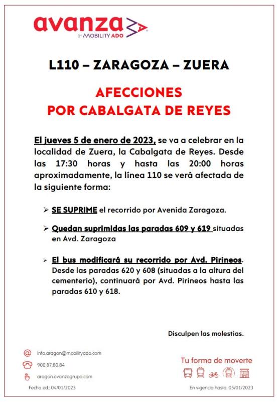 El jueves, 5 de enero, con motivo de la cabalgata de Reyes Magos en Zuera de 17:30 a 20:00 horas aprox. se suprimen las paradas 609 y 619 de Av. Zaragoza