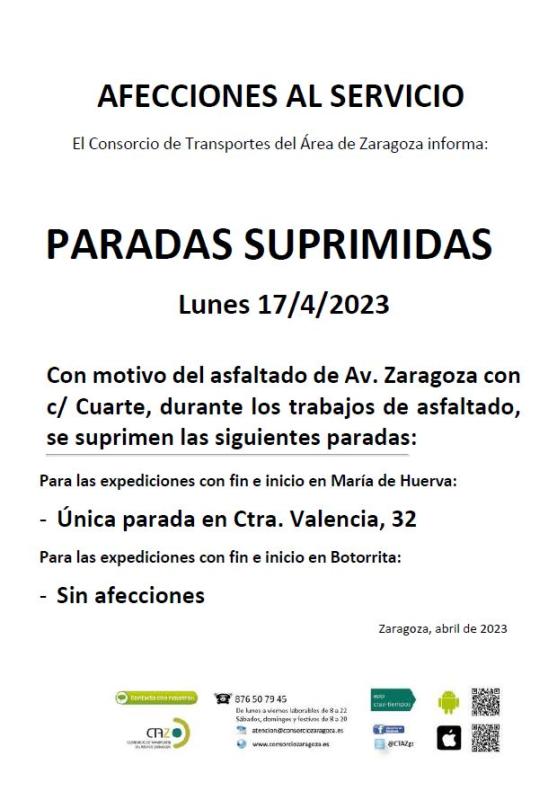 Desde el 17 de abril de 2023 durante los trabajos de asfaltado de Av. Zaragoza se producirán afecciones en los recorridos y paradas de la L411
