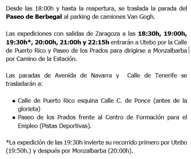 - Las expediciones con salidas de Zaragoza a las 18:30h, 19:00h, 19:30h*, 20:00h, 21:00h y 22:15h acceden a Utebo por la Av. Puerto Rico y Pº de los Prados para continuar hacia Monzalbarba por Camino de la Estación.