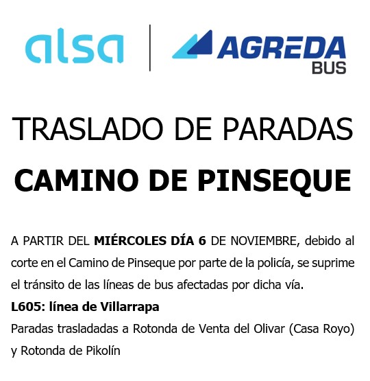 (5/11/2024) debido al corte del Camino de Pinseque por parte de la policía, se suprime el tránsito de las líneas de bus afectadas por dicha vía hasta el fin de las afecciones. Paradas trasladadas a Rotonda de Venta del Olivar (Casa Royo) y Rotonda de Pikolín.