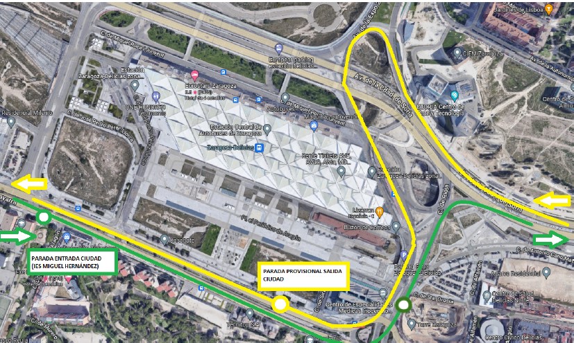 En sentido salida de Zaragoza se suprimen las paradas 301 (Av. Navarra, 12) y 222 (Av. Navarra, 54-centro cívico) y se habilitan las siguientes paradas provisionales de subida de viajeros: