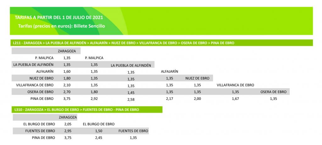 - En la L310, el cambio de tarifa sólo afecta al recorrido Zaragoza-Pina de Ebro y Pina de Ebro-Zaragoza.